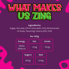 Sugar, Glucose,Citric Acid, Malic Acid, Bicarbonate of Soda, Flavouring.