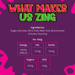 Sugar, Glucose,Citric Acid, Malic Acid, Bicarbonate of Soda, Flavouring. No added colours.